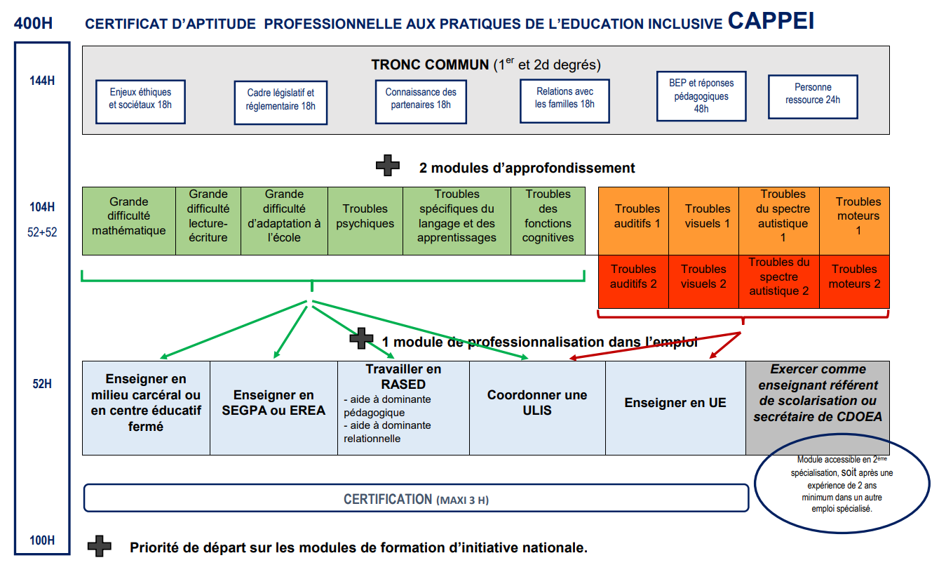 Le CAPPEI est un certificat pour les enseignant·es spécialisé·es depuis 2017. Pour l’obtenir, ils et elles peuvent passer par une formation commune aux 1er et 2nd de-grés (titulaires et contractuel·les en CDI) qui est prévue sur 300h en différents mo-dules en alternance avec le terrain. Une fois la candidature acceptée, les ensei-gnant·es désirant suivre la formation devront être positionné·es sur un « poste sup-port de formation » correspondant au parcours suivi.