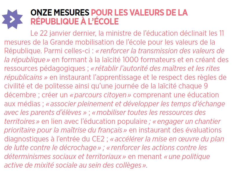 C'est en effet à l'école que peut se construire une culture partagée, que peut se développer un sentiment d'appartenance et pour cela on ne peut pas en rester à des cours de morale civique et laïque. La maîtrise du langage est une condition indispensable de la réussite, de cette mise en partage. Le ministère propose de la tester en début de CE2, mais pourquoi attendre le cycle III ? Elle doit plus que jamais être une priorité et ce, dès la maternelle, notamment en allégeant le nombre d'enfants par classe, en améliorant le taux d'encadrement, en créant de nouveaux métiers de soutien aux enseignants et aux élèves... C'est encore le meilleur terreau pour transmettre les valeurs de la République. Face à tant de complexité, les enseignants ne peuvent pas rester seuls. Catherine, enseignante dans le 19e à Paris, souligne « le besoin d'aide ». « Le seul enseignement de la laïcité ne suffira pas pour apporter la réflexion et la prise de distance par rapport à tous les discours qu'entendent les élèves » affirme-t-elle (lire ici). Des propos qui font écho à ceux de Benoît Falaize pour qui « les notions de laïcité doivent d'abord et avant tout s'expérimenter. Sinon c'est du catéchisme ». « Tout le monde sait qu'il faut ‘respecter', ne pas être raciste, mais en pratique, il faut faire en sorte que ces éléments s'inscrivent dans une République en actes » avance-t-il. (lire ici) La tâche est-elle si difficile ? Il y faudra en tout cas autre chose que des injonctions. Il y faudra des moyens en formation, en soutien et accompagnement, en outillage pédagogique. Il y faudra une politique volontariste sur les effectifs et sur la formation des maîtres. Et surtout ne pas oublier que, comme le souligne le sociologue Hicham Benaïssa spécialiste des religions et de la laïcité au CNRS, « malgré tout ce qu'on peut dire la France est un pays formidablement intégrateur » (lire ici). L'école n'y est pas pour rien mais elle doit aujourd'hui relever un défi nouveau.