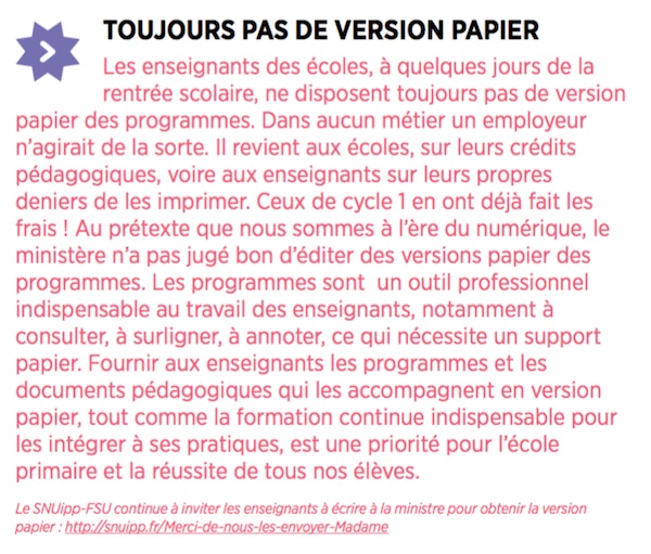 De même, les enseignants attendent encore une version papier des programmes seulement disponibles sous forme numérique (lire ici). Si Fenêtres sur cours ouvre le dossier à la veille de la reprise de la classe, c'est bien pour aider les enseignants à y voir plus clair, à décrypter des programmes introduisant de vraies nouveautés dans la conception des apprentissages, la manière d'enseigner, les pratiques pédagogiques.