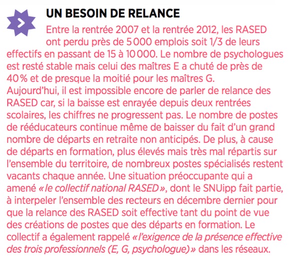 Les RASED nouveaux sont-ils arrivés ? La circulaire du mois d'août 2014 appelle à revoir leur fonctionnement, mais comment faire quand 5 000 postes supprimés entre 2007 et 2012 n'ont pas été reconstitués et que de nombreux réseaux, même en REP+, restent encore aujourd'hui incomplets ?